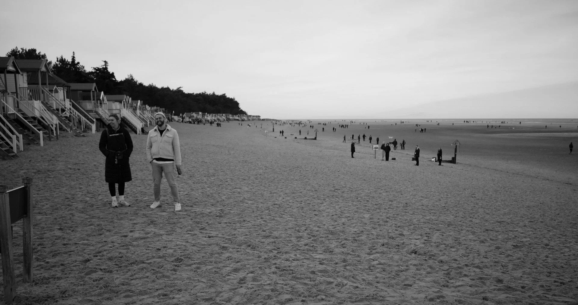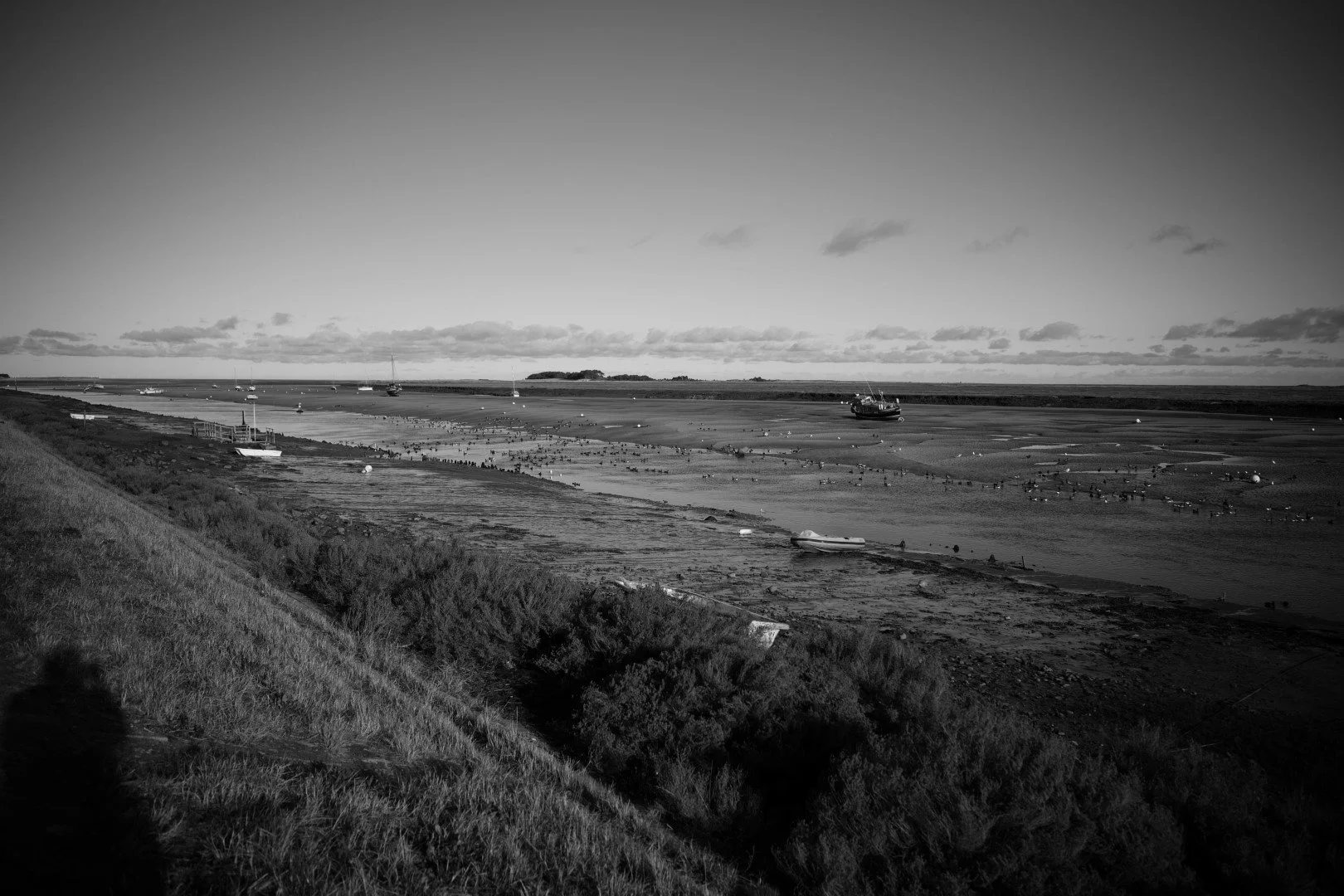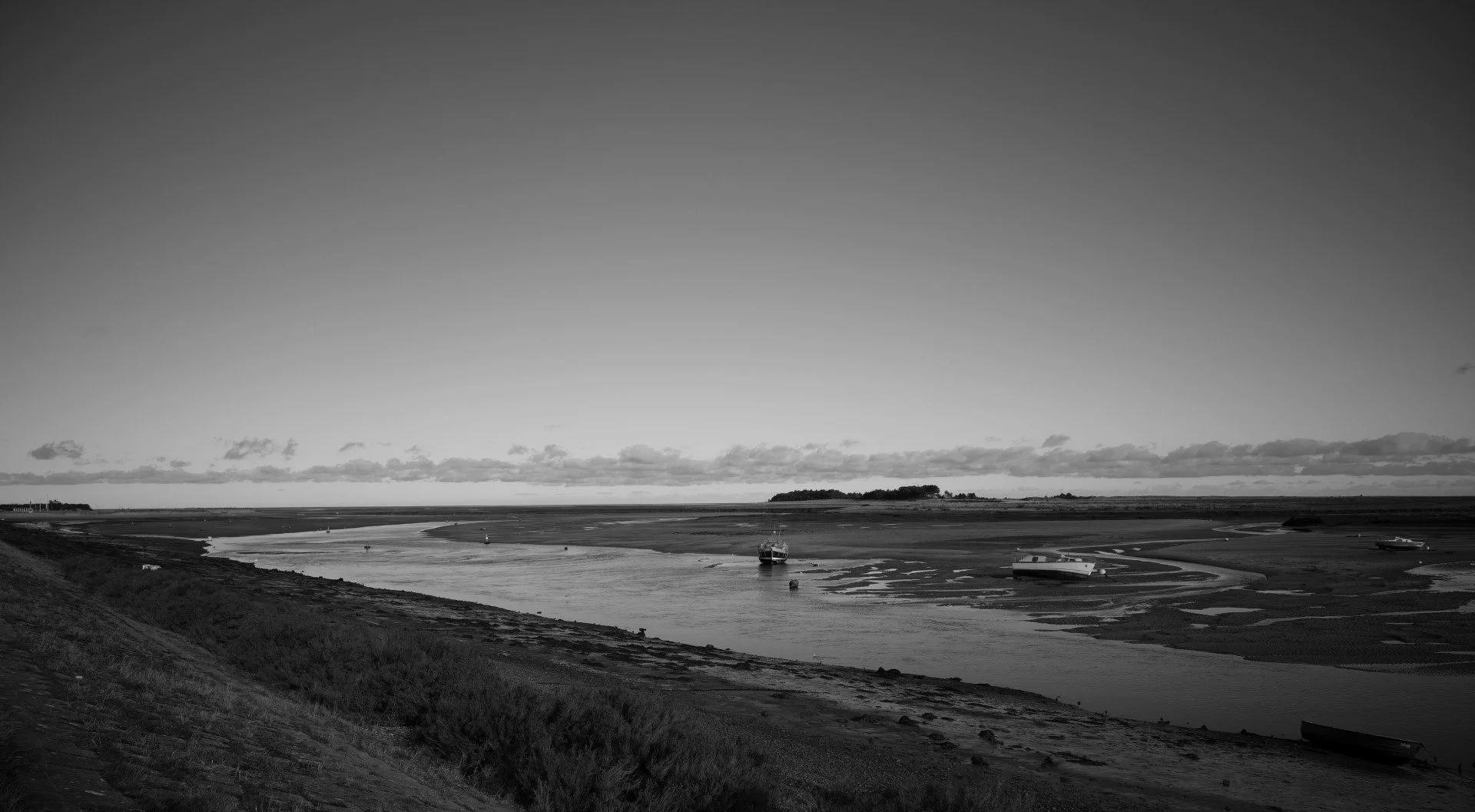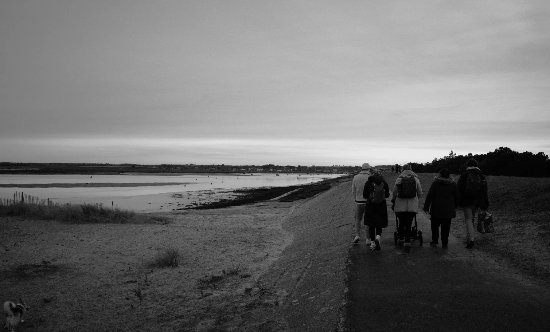 The sky is big the person small. He walks along the empty bay, to stop and see the air and land, fills hearts with joy and calm.